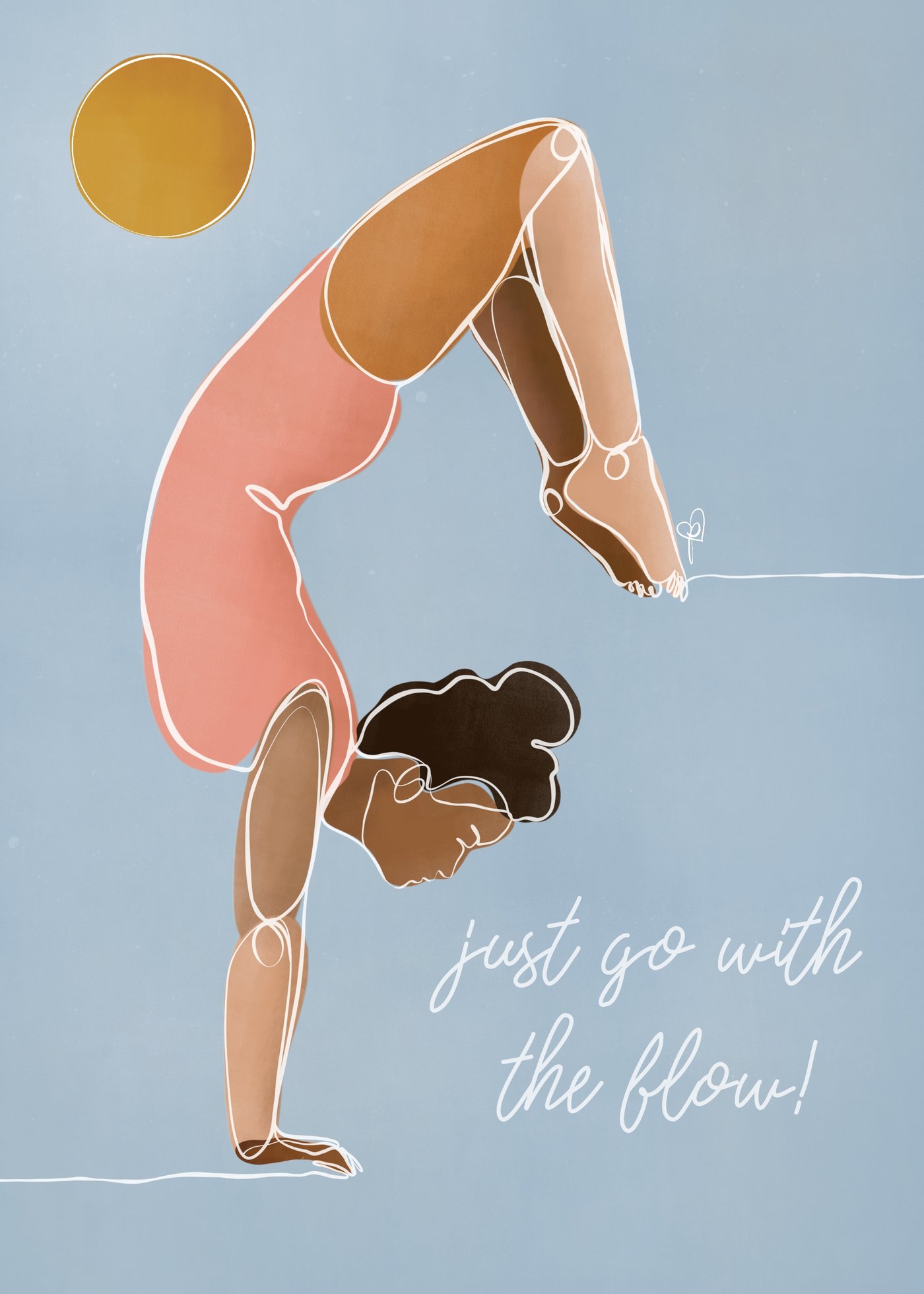 This illustration is called Balance & Flow. This illustration is the first in a new series that I am working on called Go With The Flow. The idea for this illustration and the entire series were born out of my own love for doing yoga and how much cultivating a daily practice has improved virtually every area of life from diet, to mental health, and just practicing discipline. Anyone who has practiced yoga knows that it is about marrying your breath with the movements as you flow from one pose to another --- it’s a balance between breath and body. Life is all about balances, and I think especially right now, we could all use a reminder to breathe, find our balance, and just go with the flow!