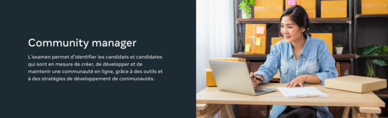 Audience de l’examen : les leaders de communauté, les chef·fes de marque et les gestionnaires de réseaux sociaux qui possèdent les compétences et les connaissances requises pour gérer, développer et connecter des communautés, et qui comprennent les politiques et les réglementations de la plateforme.